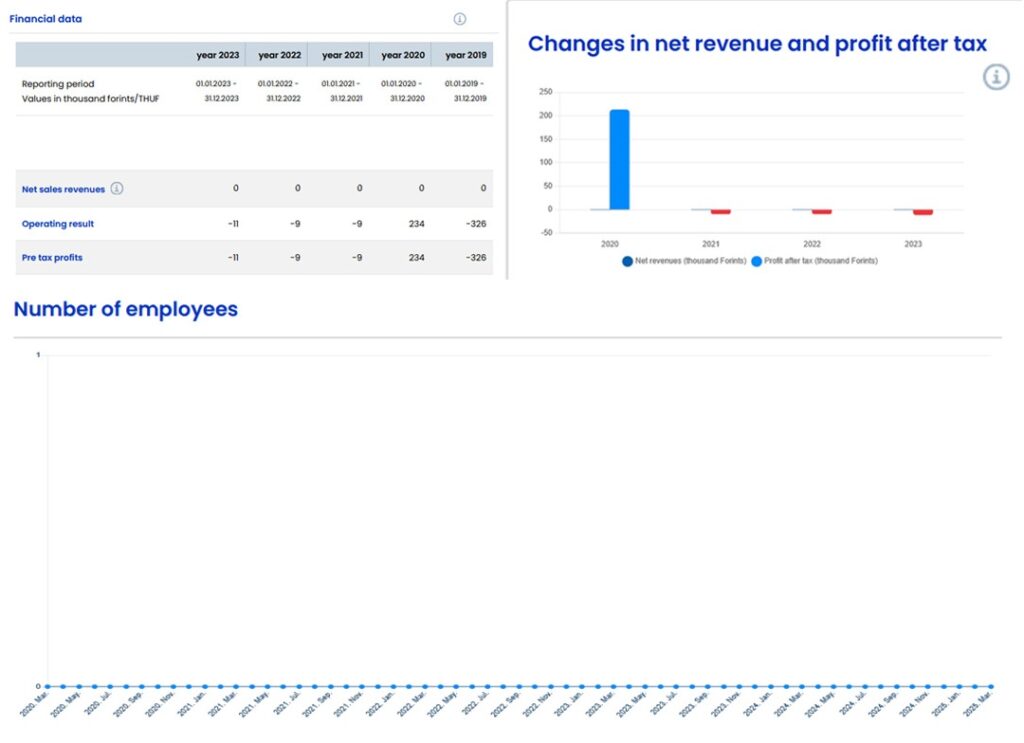 Po dostupnim podacima ova firma je u 2023. godini zabilježila gubitak od 11 hiljada forinti ili 27 evra i ima više obaveza nego imovine, odnosno vrlo nisku sposobnost za kratkoročno izmirenje dugova. Za sve prikazane godine nije imala prodaju, ni poslovnu aktivnost.