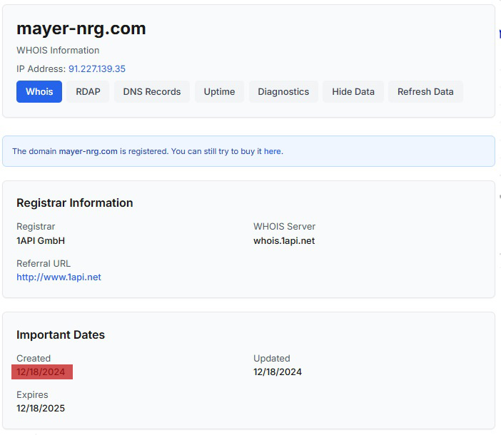 Web stranica kompanije mayer-nrg.com otvorena je prema podacima sa platforme Whois, mjesec dana prije preuzimanja koncesije tačnije u decembru 2024. godine.