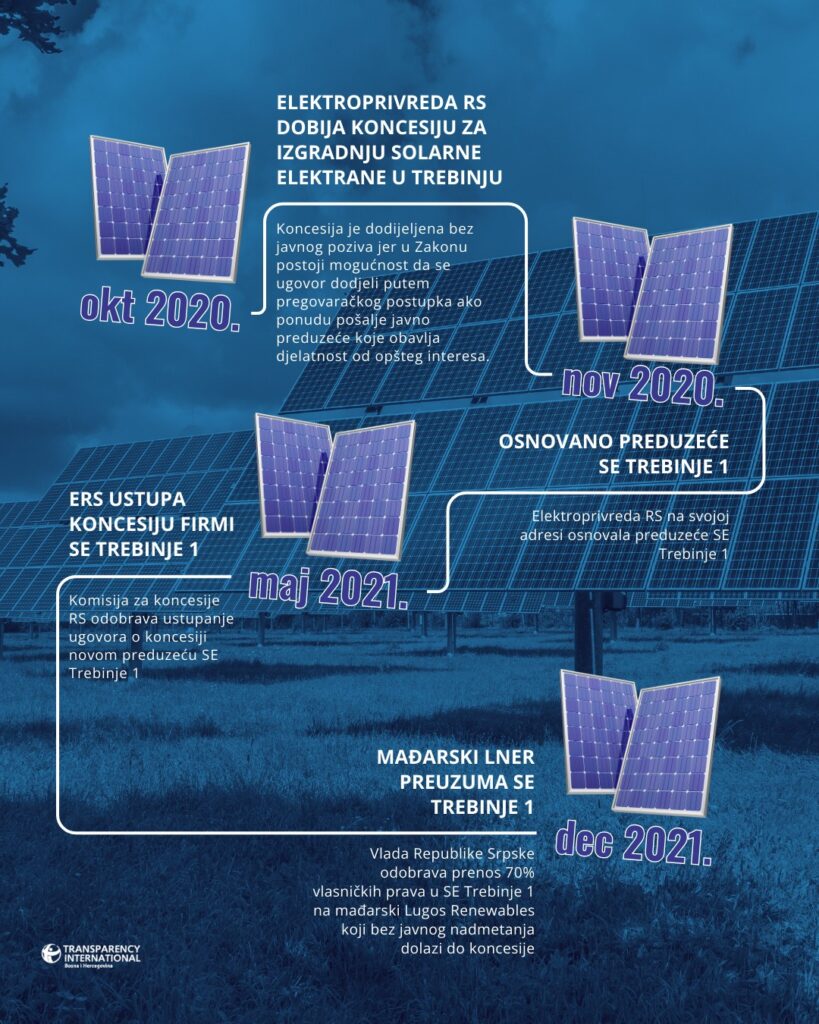 Projekat izgradnje solarne elektrane u Trebinju od samog početka prate brojne kontroverze, a TI BiH je već ukazivao na to da je mađarski investitor uveden u posao zaobilaženjem zakona i javnog nadmetanja. Pored pomenutog spora sa Komisijom za koncesije RS, treba reći da TI BiH nije mogao dobiti ni informacije od Elektroprivreda RS, koja krije uslove pod kojima je ustupljeno većinsko vlasništvo nad SE Trebinje 1 mađarskom investitoru.