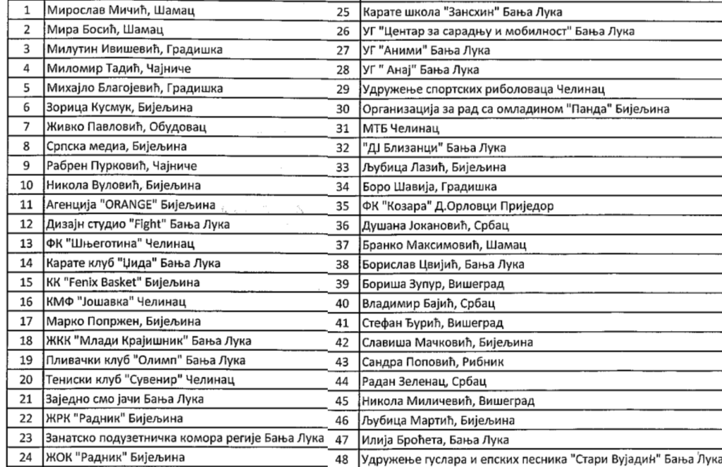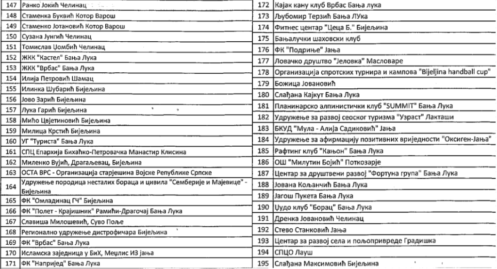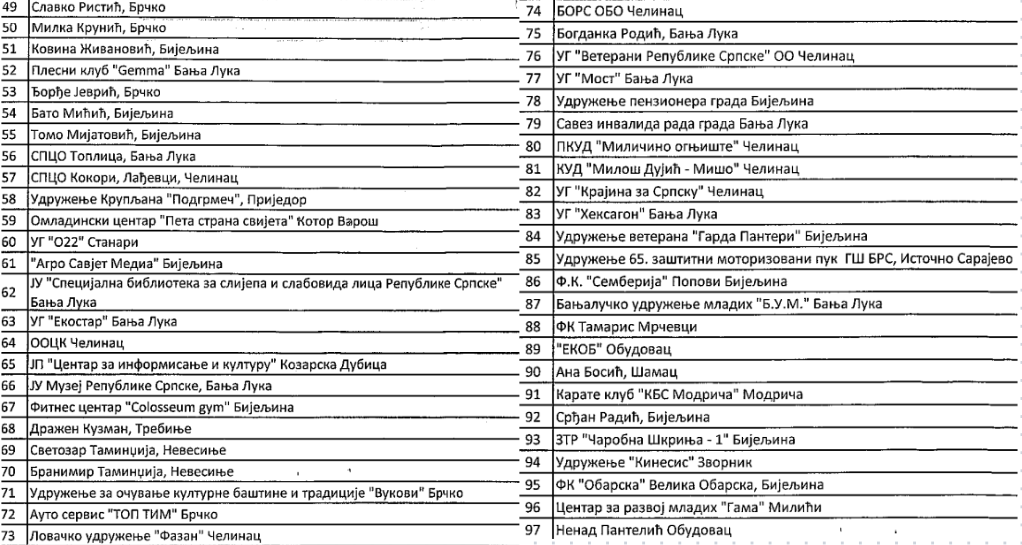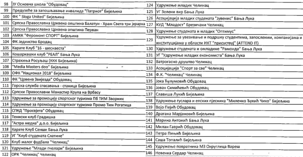 Novca je bilo i za „Zanatsko preduzetničku komoru regije Banjaluka“, dizajn studio „Fight“, udruženje guslara i epskih pjesnika „Stari Vujadin“, „Udruženje mladih ekonomista“ i brojne druge.