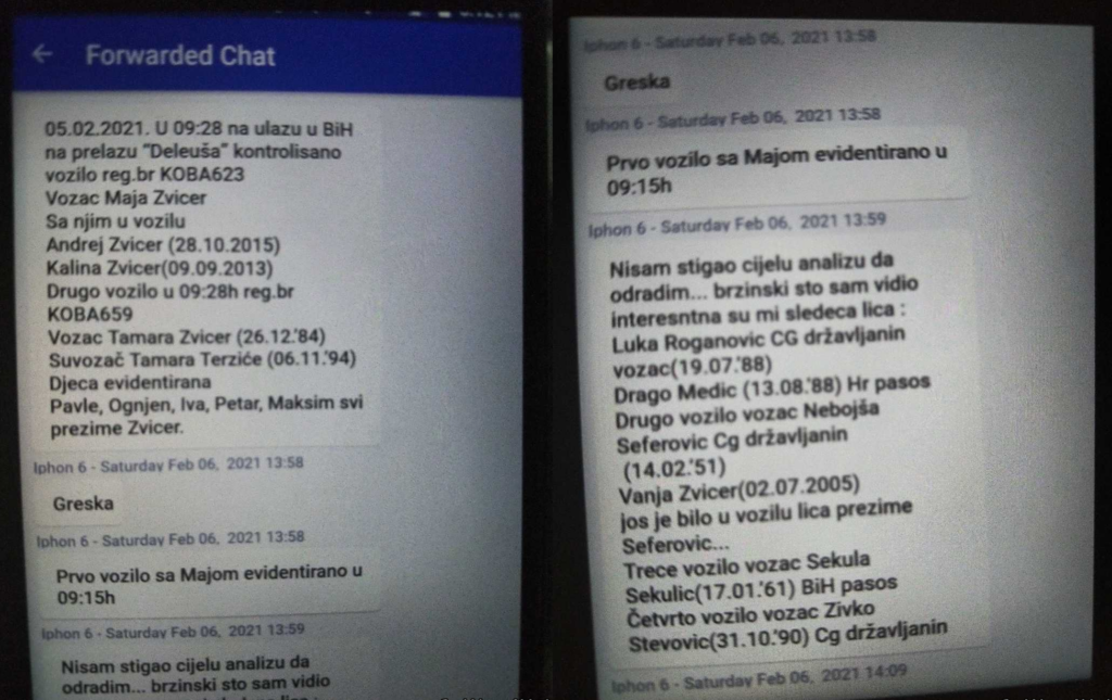 Pema Sky prepiskama od 6. februara 2021,. Sani Al Murda šalje dvije fotografije na kojima je vidljiv uslikan displej mobilnog aparata na kome se nalazi transkript tekstualnih poruka sa nepoznatom osobom. Kasnije će se utvrditi da je “nepoznata osoba”, zapravo, granični policajac Nemanja Nogoštić. Granični policajac, tako, obavještava članove Škaljarskog klana da su preko Graničnog prelaza Deleuša u BiH ušli: Maja Zvicer, Andrej Zvicer, Kalina Zvicer, Tamara Zvicer, Tamara Terzić, Pavle Zvicer, Ognjen Zvicer, Iva Zvicer, Petar Zvicer, Maksim Zvicer, Luka Roganović, Drago Medić, Nebojša Seferović, Vanja Zvicer, Sekula Sekulić, Živko Stevović. U pitanju su članovi porodice Radoja Zvicera, vođe Kavačkog klana.