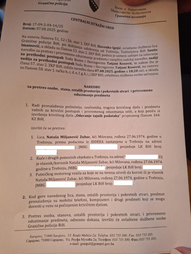 “Na osnovu članova 51,52, i 56, stav 1 ZKP-a BiH, Slaven Ignjić, ovlašteno službeno lice Granične policije BiH, po dobivanju odobrenja od tužitelja Tužiteljstva BiH Sanite Imamović, u skladu sa članom 53 stab ZKP BiH, podnio je je usmeni zahtjev za izdavanje naredbe za pretres i privremeno oduzimanje predmeta i saopćio sadržaj naredbe sudiji za prethodni postupak Suda BiH Tatjani Kosović, te nakon što je sudija za prethodni postupak Suda BiH Tatjana Kosović izdala naredbu 7.8. 2025. godine u 18.20 sati, ovlaštena službena osoba sačinjava Naredbu za pretres osobe, stana i ostalih prostorija i pokretnih stvari i privremeno oduzimanje predmeta”, navedeno je u aktu Granične policije.