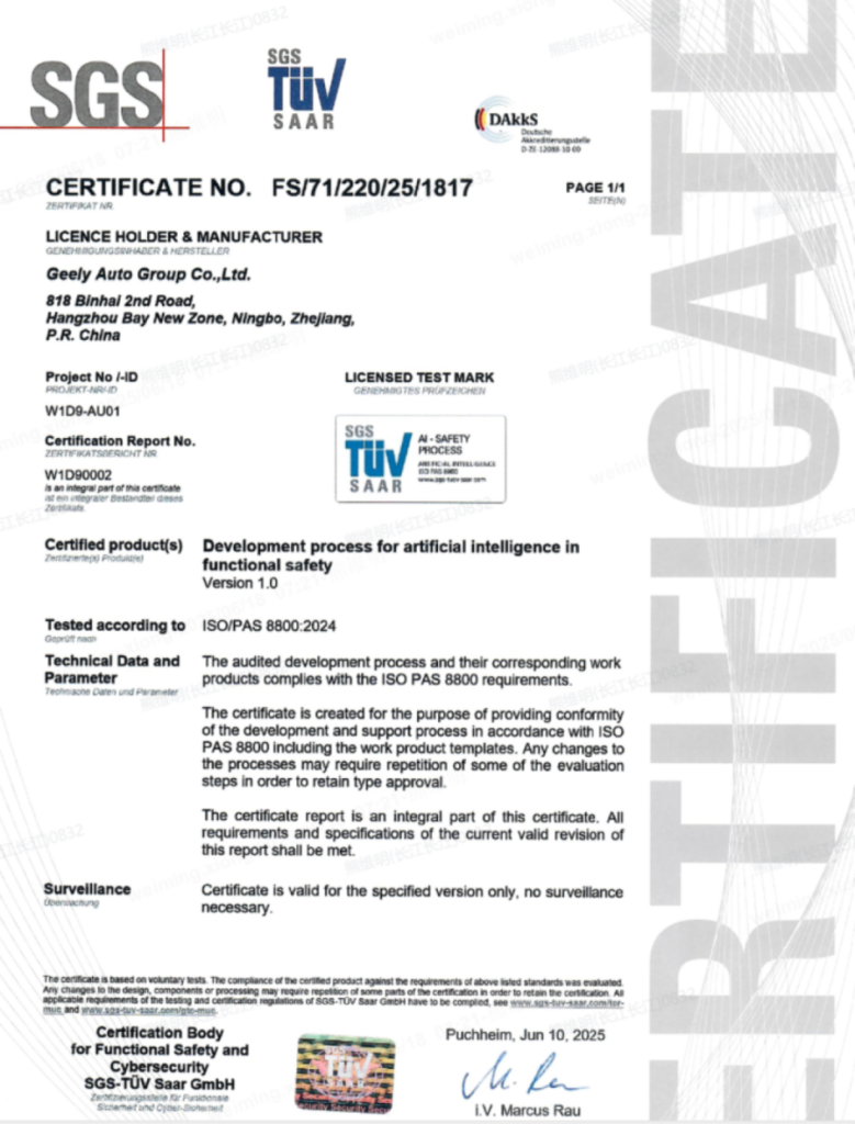 Kompanija Geely saopštila je da je postala prvi svetski proizvođač automobila koji je dobio sertifikat ISO/PAS 8800 za bezbednost drumskih vozila i sistema veštačke inteligencije.
