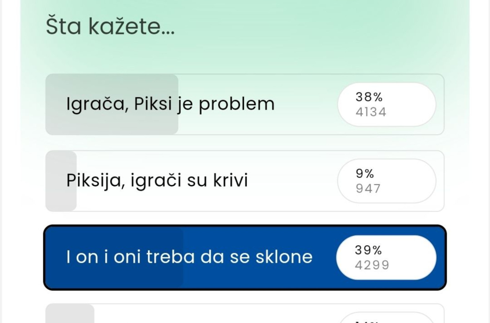 38% ljudi je reklo da je Piksi problem, dok je 39% ljudi reklo da i Stojković i igrači treba da se sklone i da su ljuti i na njih i na njega.