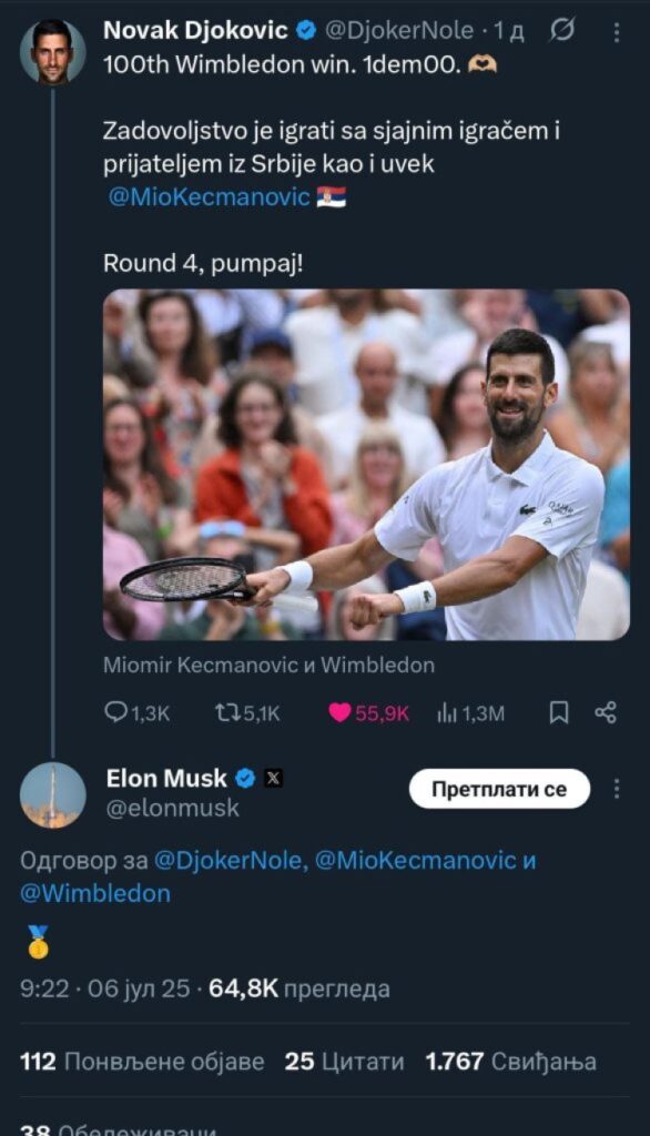 Američki milijarder Ilon Mask, reagovao je na objavu Novaka Đokovića nakon pobjede nad Miomirom Kecmanovićem u trećem kolu Vimbldona.
