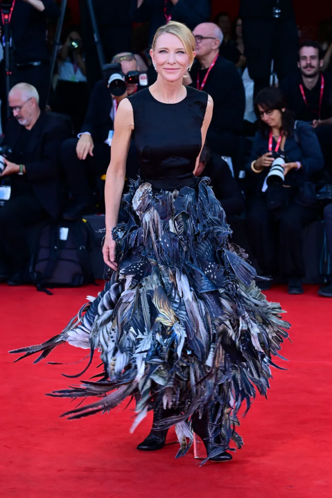 Venecijanski filmski festival je oduvek bio domaćin nezaboravnih trenutaka, a ovog puta, Kejt Blančet je ukrala šou na crvenom tepihu. U svom jedinstvenom izdanju, oskarovka je privukla sve poglede u crnoj haljini sa voluminiziranom suknjoma od slojeva tamno sivog perja, koja je doslovno oživela na crvenom tepihu, podsećajući na pticu koja je upravo poletela.