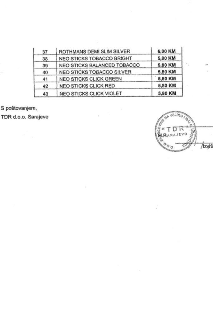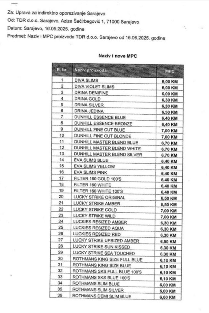 Kompanije TDR d.o.o. Sarajevo od danas ima nove maloprodajne cijene cigareta.
