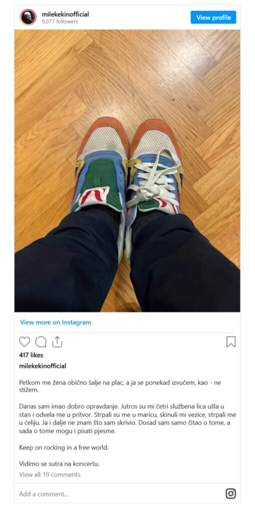 “Petkom me žena obično šalje na plac, a ja se ponekad izvučem, kao – ne stižem. Danas sam imao dobro opravdanje. Jutros su mi četri službena lica ušla u stan i odvela me u pritvor. Strpali su me u maricu, skinuli mi vezice, spremili me ćeliju. Ja i dalje ne znam što sam skrivio. Dosad sam samo čitao o tome, a sada o tome mogu i pisati pjesme. Keep on rocking in a free world. Vidimo se sutra na koncertu”, napisao je Kekin.