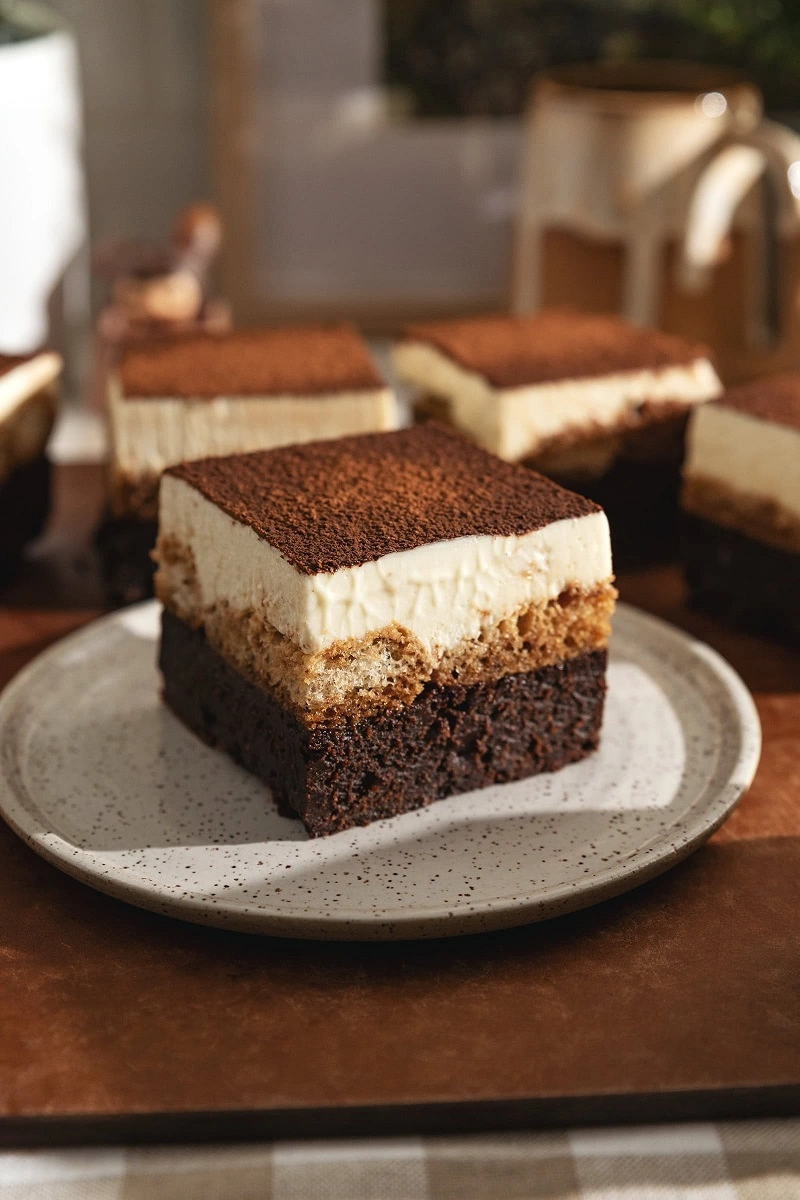 Ove tiramisu brownie kocke su spoj bogatog sloja brownie kolača s aromatičnim piškotama natopljenim espressom i kremastim mascarpone slojem