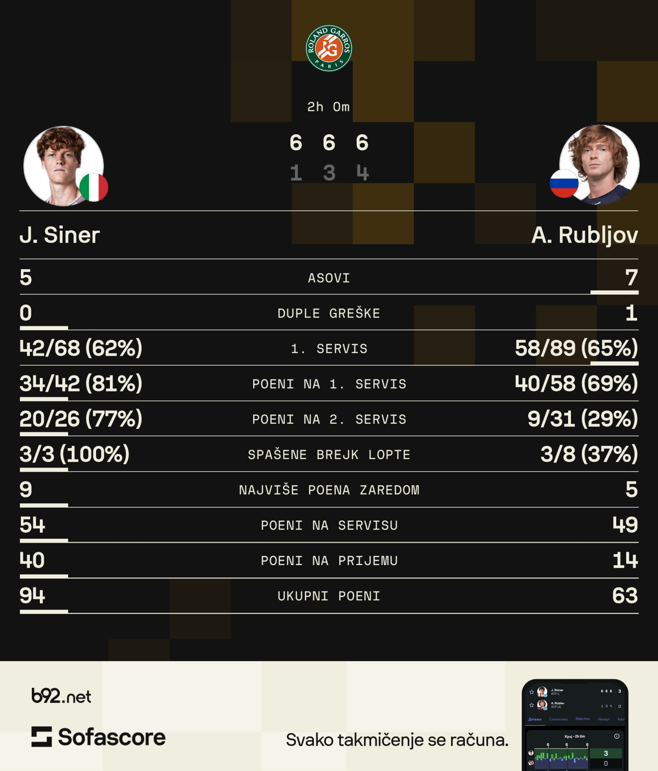 Na kraju, Siner dolazi do pobede na servis rivala. Imao je Rubljov dva puta šansu da produži meč, nije to uspeo da iskoristi.