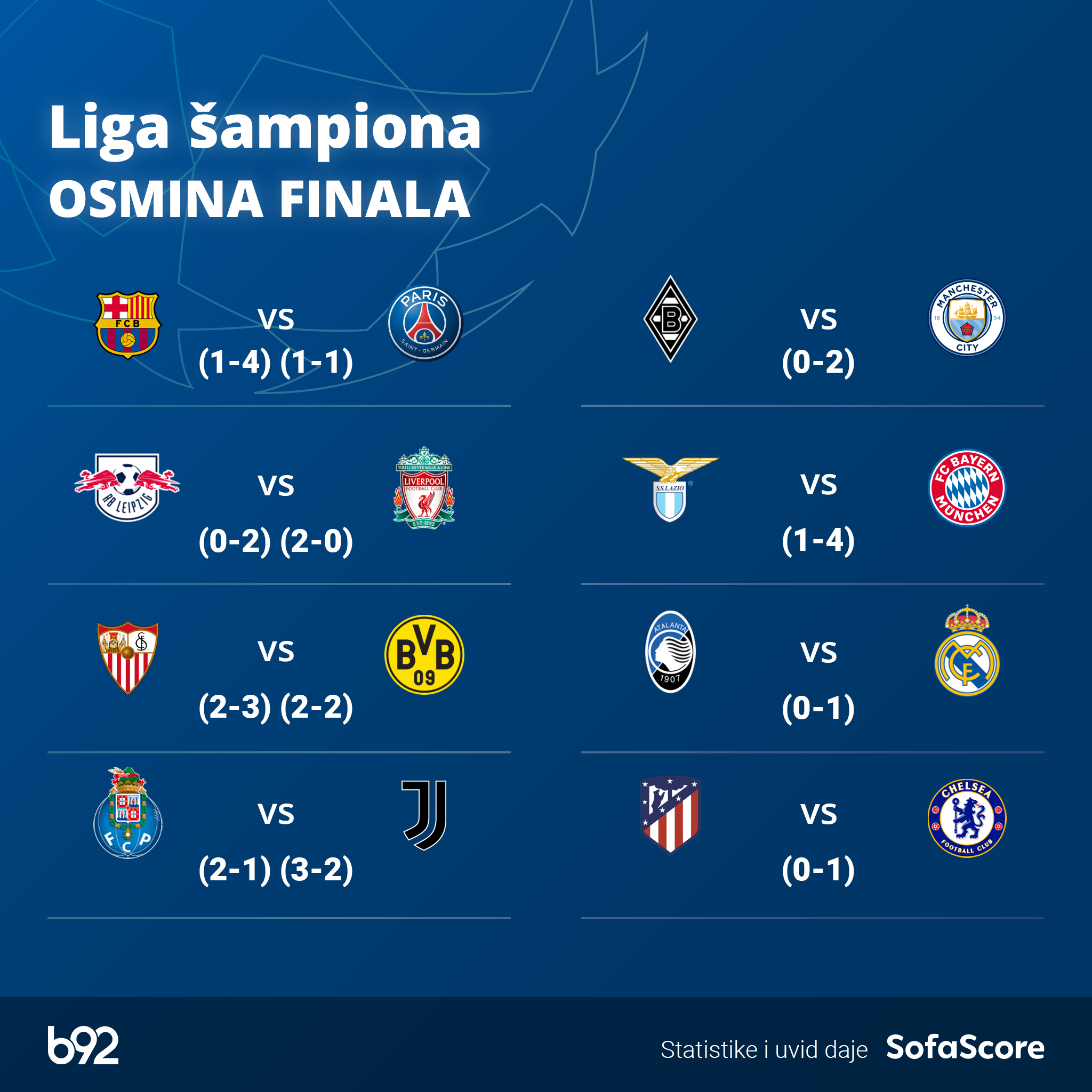 U utorak igraju Mančester siti – Borusija Menhengladbah i Real Madrid – Atalanta, a u sredu su na programu revanši Bajern Minhen – Lacio i Čelsi – Atletiko Madrid.