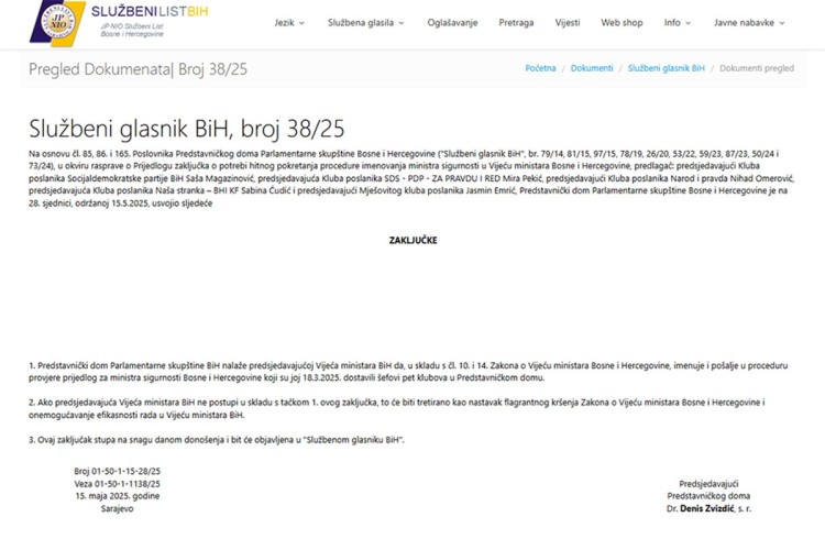“Predstavnički dom Parlamentarne skupštine BiH nalaže predsjedavajućoj Savjeta ministara BiH da u skladu sa čl. 10 i 14. Zakona o Savjetu ministara BiH, imenuje i pošalje u proceduru provjere prijedlog za ministra bezbjednosti BiH koji su joj 18. marta 2025. godine dostavili šefovi pet klubova u Predstavničkom domu”, piše u zaključku koji je objavljen u Službenog glasniku BiH.